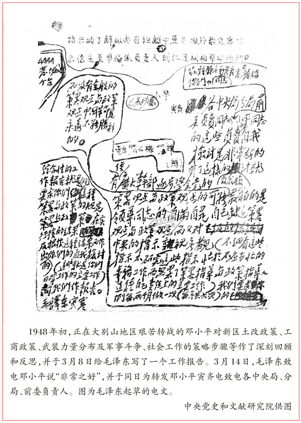 當(dāng)年3月14日,毛澤東在收到鄧小平3月8日關(guān)于新解放區(qū)全盤(pán)的策略與政策問(wèn)題給中共中央的報(bào)告后,批示向各中央局、分局、前委轉(zhuǎn)發(fā)鄧小平的報(bào)告,批語(yǔ)中給予報(bào)告高度評(píng)價(jià),同時(shí)指出:“要求你們每?jī)蓚(gè)月做一次(每年共六次)的綜合性的工作報(bào)告,就是要求你們將這種策略與政策的規(guī)定、策略與政策在實(shí)行后的結(jié)果及根據(jù)這種結(jié)果而作出的你們的自我檢討(這些就是你們?nèi)粘9ぷ鞯闹饕ぷ鳎┫蛭覀冏鲌?bào)告!