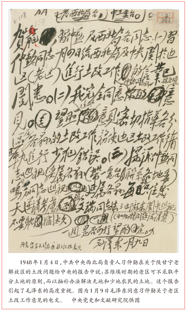 事實(shí)上,這種影響帶來(lái)的矛盾和問(wèn)題已經(jīng)在實(shí)際工作中尖銳地表現(xiàn)出來(lái)。1948年1月2日,中共中央西北局負(fù)責(zé)人習(xí)仲勛向中央報(bào)告了有的部隊(duì)破壞紀(jì)律,在新解放區(qū)沒(méi)收商人財(cái)產(chǎn)和敵軍官佐及其家屬財(cái)產(chǎn),造成惡劣影響的行為。當(dāng)月4日,習(xí)仲勛再次向中央報(bào)告,指出老區(qū)土地改革中照搬新區(qū)做法,可能導(dǎo)致打擊面過(guò)寬的問(wèn)題。習(xí)仲勛的兩次報(bào)告,引起了毛澤東的高度重視。1月9日,毛澤東批示轉(zhuǎn)發(fā)了習(xí)仲勛1月2日的報(bào)告,并做了批語(yǔ);同日又致電西北局,同意習(xí)仲勛關(guān)于老區(qū)土地改革工作的意見(jiàn)。習(xí)仲勛的報(bào)告反映了各地在制定和執(zhí)行政策上存在的偏差,不能不引起毛澤東的高度重視。收到報(bào)告后僅僅相隔數(shù)日,毛澤東就起草了建立報(bào)告制度的指示。