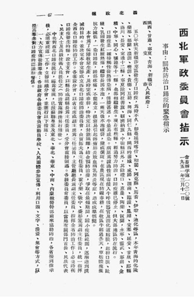 西北軍政委員會(huì)《關(guān)于防治口蹄疫的緊急指示》