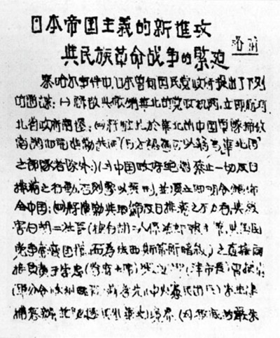 張聞天(洛甫)所寫《日本帝國(guó)主義的新進(jìn)攻與民族革命戰(zhàn)爭(zhēng)的緊迫》