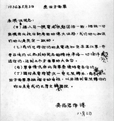 張聞天同林育英(張浩)、周恩來、毛澤東、博古聯(lián)名致朱德、張國(guó)燾、任弼時(shí)的電報(bào)