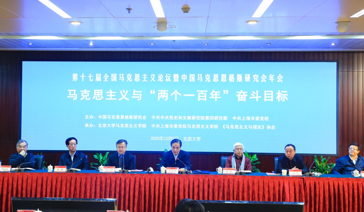 2020年12月6日,第十七屆全國(guó)馬克思主義論壇暨中國(guó)馬克思恩格斯研究會(huì)年會(huì)在北京召開。本屆論壇由中國(guó)馬克思恩格斯研究會(huì)、中央黨史和文獻(xiàn)研究院第四研究部、上海市委黨校聯(lián)合主辦,北京大學(xué)馬克思主義學(xué)院、上海市委黨校馬克思主義學(xué)院、《馬克思主義與現(xiàn)實(shí)》雜志編輯部共同承辦。論壇采取了線上與線下相結(jié)合的形式,北京與會(huì)代表現(xiàn)場(chǎng)出席會(huì)議,外地與會(huì)代表以視頻會(huì)議形式參會(huì)。論壇主題為“馬克思主義與‘兩個(gè)一百年’奮斗目標(biāo)”。中國(guó)馬克思恩格斯研究會(huì)會(huì)長(zhǎng)、中共中央黨史和文獻(xiàn)研究院原副院長(zhǎng)、中共中央編譯局原局長(zhǎng)賈高建,中共中央黨史和文獻(xiàn)研究院第四研究部主任、中國(guó)馬克思恩格斯研究會(huì)副會(huì)長(zhǎng)兼秘書長(zhǎng)馮雷,中共上海市委黨校常務(wù)副校長(zhǎng)徐建剛出席開幕式并致辭。中國(guó)馬克思恩格斯研究會(huì)副會(huì)長(zhǎng)王東、郝立新、徐俊忠、楊耕,中國(guó)馬克思恩格斯研究會(huì)原副會(huì)長(zhǎng)顧海良、韓慶祥等出席會(huì)議。