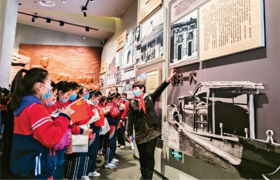 2021年3月25日,內(nèi)蒙古呼和浩特市玉泉區(qū)南茶坊小學(xué)學(xué)生在老師帶領(lǐng)下走進(jìn)內(nèi)蒙古博物院“內(nèi)蒙古革命史陳列”展廳,感受革命情懷,接受“紅色文化”教育。 人民視覺 丁根厚/攝