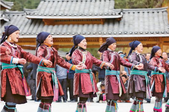 2021年3月21日,廣西柳州三江侗族自治縣八江鎮(zhèn)布代村舉辦傳統(tǒng)春社節(jié),當(dāng)?shù)厝罕娚碇褡迨⒀b,縱情傳唱百年黨史,激情歡歌家鄉(xiāng)巨變,動(dòng)情喜頌黨的恩情。 人民視覺 龔普康/攝