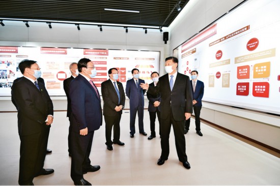 2020年11月12日,浦東開發(fā)開放30周年慶祝大會在上海市舉行。中共中央總書記、國家主席、中央軍委主席習近平在會上發(fā)表重要講話。這是當天上午,習近平等參觀“在國家戰(zhàn)略的引領下——浦東開發(fā)開放30周年主題展”。 新華社記者 殷博古/攝