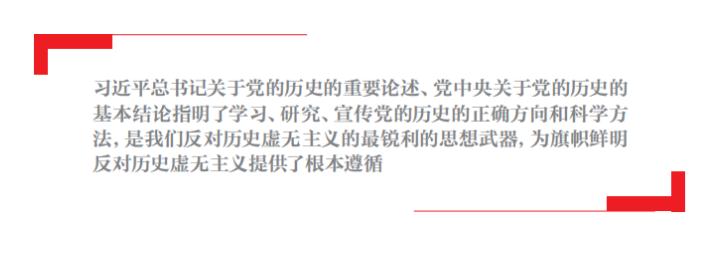 黨的歷史是與黨的前途命運緊緊連在一起的。在我們黨成立100周年之際,歷史虛無主義一定不會甘于失敗,一定會通過各種方式興風(fēng)作浪,當(dāng)前反對歷史虛無主義尤其具有重大而緊迫的現(xiàn)實意義。我們絕不能任由歷史虛無主義蔓延甚至泛濫,絕不能任由歷史虛無主義瓦解人們對黨的領(lǐng)導(dǎo)、對中國特色社會主義道路、對社會主義核心價值觀的信心和信念,絕不能任由歷史虛無主義砸鍋打碗。應(yīng)當(dāng)通過黨史學(xué)習(xí)教育,通過大力宣傳正確黨史觀,筑起在意識形態(tài)領(lǐng)域抵制歷史虛無主義的銅墻鐵壁,不給歷史虛無主義任何可乘之機,這是全黨全社會的共同責(zé)任。
