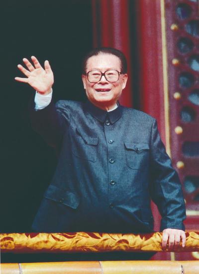 1999年10月1日,江澤民在天安門城樓上向參加慶祝中華人民共和國成立50周年大會的群眾游行隊(duì)伍揮手致意