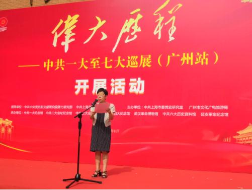 上海市委黨史研究室主任嚴(yán)愛(ài)云在開(kāi)幕儀式上致辭。她指出,中國(guó)共產(chǎn)黨的歷史上,上海與廣州都曾經(jīng)是中國(guó)革命重要的紅色中心。中共一大召開(kāi)后,中共早期中央機(jī)關(guān)長(zhǎng)期設(shè)在上海。1923年5月,中共中央為籌備召開(kāi)中共“三大”,將中共中央機(jī)關(guān)從上海遷到廣州。黨的三大后,根據(jù)中國(guó)革命發(fā)展形勢(shì)需要,中央機(jī)關(guān)又從廣州遷回上海。建黨早期廣東籍中共黨員楊殷、彭湃、楊匏安等,都曾受黨派遣到上海黨中央工作,并犧牲在上海!盎赝麃(lái)時(shí)的路,看清腳下的路,堅(jiān)定前行的路”。通過(guò)這次巡展,相信更多的黨員、群眾會(huì)藉此增進(jìn)對(duì)中國(guó)共產(chǎn)黨光榮革命歷史的了解,進(jìn)而用黨的奮斗歷程和偉大成就鼓舞斗志、明確方向,用黨的光榮傳統(tǒng)和優(yōu)良作風(fēng)堅(jiān)定信念、凝聚力量,用黨的實(shí)踐創(chuàng)造和歷史經(jīng)驗(yàn)啟迪智慧、砥礪品格,進(jìn)一步使初心薪火相傳,把使命永擔(dān)在肩,奮力走好新時(shí)代的長(zhǎng)征路!