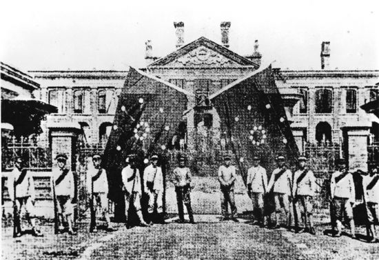 武昌起義勝利后,各省紛紛響應(yīng),宣布獨(dú)立。圖為革命軍占領(lǐng)武昌城后,軍政府掛起象征十八省團(tuán)結(jié)一致的十八星軍旗(資料照片)。 新華社發(fā)