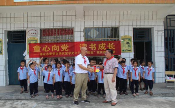 圖為崇左市委黨史研究室在寧明縣峙浪鄉(xiāng)那兵小學(xué)開展“童心向黨 讀書成長”活動(dòng),給該小學(xué)師生贈(zèng)送課外閱讀書籍和黨史書籍