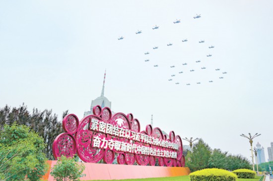 圖為2021年7月1日,慶祝中國共產(chǎn)黨成立100周年大會在北京天安門廣場隆重舉行,飛行編隊(duì)飛過北京上空。(圖片來源:人民視覺)