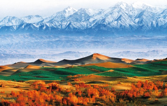 黨的十八大以來,以習近平同志為核心的黨中央以前所未有的力度抓生態(tài)文明建設,我國生態(tài)環(huán)境保護發(fā)生歷史性、轉折性、全局性變化。甘肅省張掖市黑泉村曾長期受風沙襲擾,經(jīng)過當?shù)卮迕駭?shù)十年不懈努力,肆虐的“黃龍”被層層“綠網(wǎng)”牢牢鎖住,實現(xiàn)了“綠富同興”。圖為祁連山下的西沙窩防風固沙林帶。 鄭耀德/攝