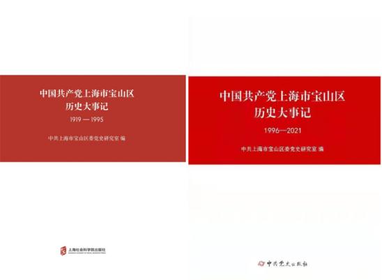 日前,在上海市寶山區(qū)委領(lǐng)導(dǎo)和上海市委黨史研究室指導(dǎo)下,由上海市寶山區(qū)委黨史研究室組織編撰的《中國共產(chǎn)黨上海市寶山區(qū)歷史大事記》正式出版。該書分為《中國共產(chǎn)黨上海市寶山區(qū)歷史大事記》(1919-1995)和《中國共產(chǎn)黨上海市寶山區(qū)歷史大事記》(1996—2021)兩冊,分別由上海社會科學(xué)院出版社、中共黨史出版社出版。