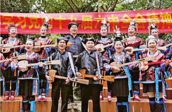近期,全國各地圍繞學(xué)習(xí)宣傳貫徹黨的十九屆六中全會精神組織開展形式多樣、內(nèi)涵豐富的文化文藝活動。圖為2021年12月12日,廣西柳州市融水苗族自治縣組織駐村工作隊(duì)員和民間歌手等以侗族琵琶歌形式宣講全會精神。 人民視覺 龍濤/攝