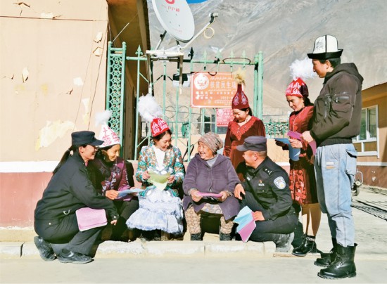 為打通黨的十九屆六中全會(huì)精神宣講“最后一公里”,新疆喀什邊境管理支隊(duì)庫地邊境派出所組織民警深入轄區(qū)抵邊村落、農(nóng)牧民夜校、施工作業(yè)點(diǎn)等進(jìn)行宣講。圖為2021年12月10日,民警前往距離葉城縣將近300公里的苦魯勒村,在家門口向村民們宣講全會(huì)精神。 人民視覺 李展朋/攝