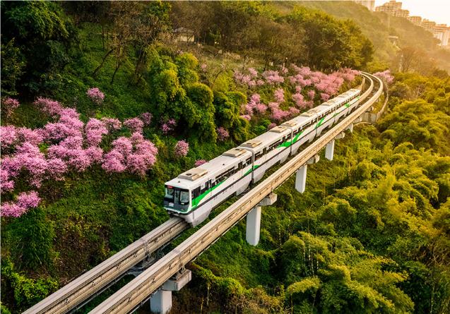百年奮斗繪就的一幅幅美好生活的壯麗畫卷,是我們黨交出的一份份優(yōu)異答卷。圖為重慶市軌道交通列車穿行在花海中。