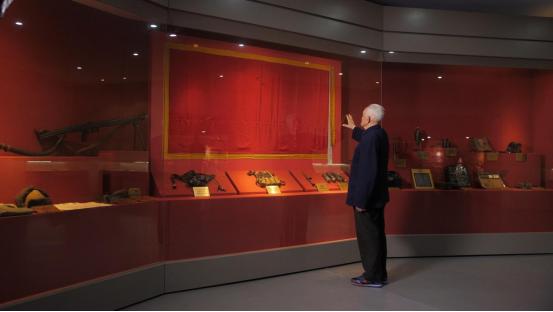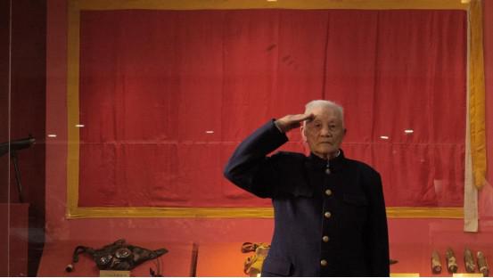 一江山島戰(zhàn)役參戰(zhàn)老戰(zhàn)士陳士勤第一時(shí)間來(lái)到紀(jì)念館,隔著玻璃櫥窗,再次看到了67年前飄揚(yáng)在一江山島上空的紅旗!爱(dāng)初為了插這面紅旗,很多戰(zhàn)友都犧牲了,希望現(xiàn)在的人們都能記住他們!崩先说哪抗饩镁猛A粼诩t旗上。