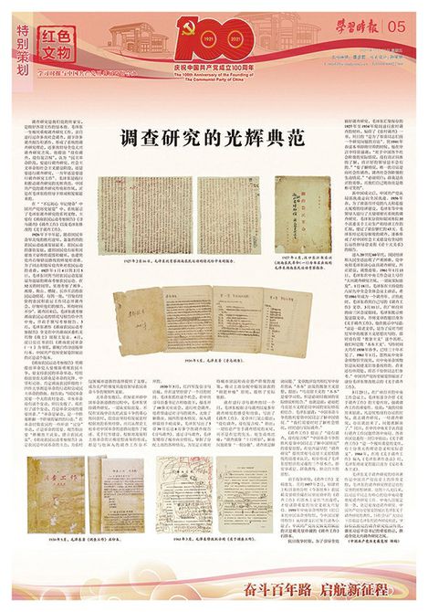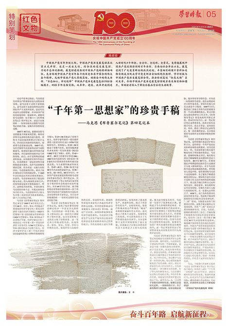 “紅色文物”系列文章梳理了中國(guó)共產(chǎn)黨人堅(jiān)持不懈的理論探索。系列文章選取了多份重要的手稿、提綱和重要文獻(xiàn)資料:馬克思《布魯塞爾筆記》第四筆記本,是“千年第一思想家”的珍貴手稿,是閃爍在中國(guó)共產(chǎn)黨人精神殿堂的思想光芒;《共產(chǎn)黨宣言》首譯本凝結(jié)著真理特有的甘甜味道,它的出版標(biāo)志著中國(guó)先進(jìn)知識(shí)分子系統(tǒng)接受馬克思主義思想的開端;毛澤東關(guān)于調(diào)查研究的系列文物,為黨留下了一份傳家寶,折射出馬克思主義與中國(guó)具體實(shí)際相結(jié)合的歷史進(jìn)程;兩個(gè)“歷史決議”本著以史為鑒、開創(chuàng)未來(lái)的精神,在重要的歷史關(guān)頭深刻總結(jié)了歷史經(jīng)驗(yàn),統(tǒng)一了全黨的思想,推進(jìn)了黨和人民的事業(yè),是黨的歷史上具有里程碑意義的光輝文獻(xiàn);《實(shí)踐是檢驗(yàn)真理的唯一標(biāo)準(zhǔn)》如春雷乍響,引起了全國(guó)范圍內(nèi)轟轟烈烈的真理標(biāo)準(zhǔn)問(wèn)題大討論,是推動(dòng)思想解放的名篇。系列文章介紹這些手稿和文獻(xiàn)的主要內(nèi)容,闡述相關(guān)史實(shí),勾勒出黨立足于中國(guó)革命建設(shè)改革的具體實(shí)際和基本國(guó)情開展理論探索的歷史進(jìn)程,引導(dǎo)讀者對(duì)黨的指導(dǎo)思想的基本內(nèi)容、發(fā)展脈絡(luò)進(jìn)一步加深認(rèn)識(shí)和理解。
