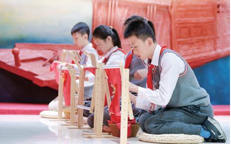 圖為鹽道街小學(xué)學(xué)生在紅色體驗館學(xué)繡黨旗,感受艱苦歲月中的堅定理想信念