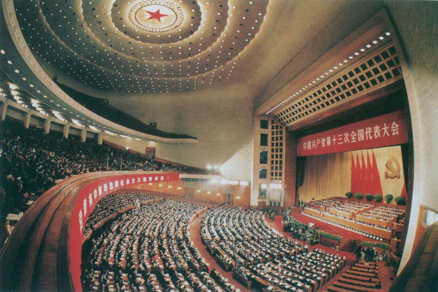 黨的十三大系統(tǒng)論述了社會(huì)主義初級(jí)階段理論和黨的基本路線,確定分三步走實(shí)現(xiàn)現(xiàn)代化的發(fā)展戰(zhàn)略。圖為黨的十三大會(huì)場(chǎng)。