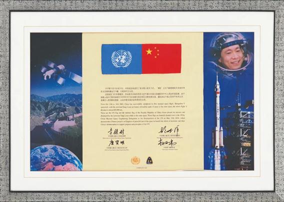 我國(guó)航天員楊利偉在太空展示的中國(guó)國(guó)旗和聯(lián)合國(guó)旗