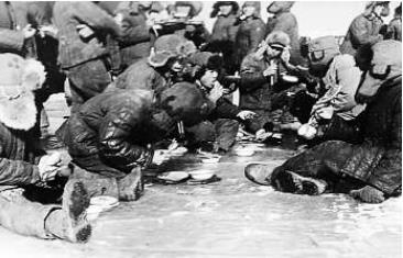 圖為大慶油田職工“五兩糧食保三餐”艱苦奮斗的場景