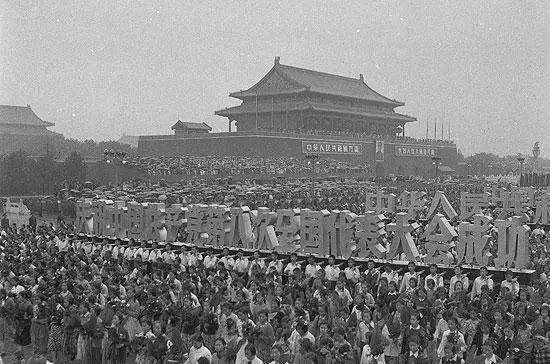 ▲1956年10月1日,國慶游行隊(duì)伍里群眾高舉“慶祝中國共產(chǎn)黨第八次全國代表大會(huì)成功”的標(biāo)語。