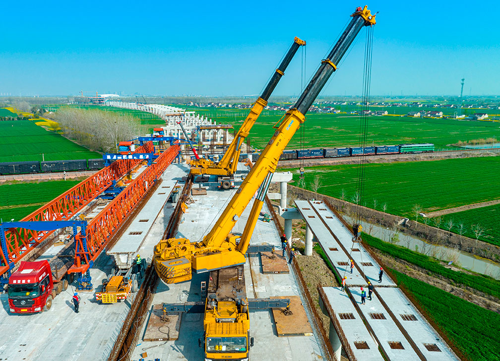 江蘇省鹽城市鹽豐快速通道二期工程現(xiàn)場,跨新長鐵路段匝道橋正在進(jìn)行箱梁吊裝。
