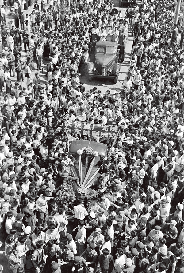 1956年7月15日,長春第一汽車制造廠生產(chǎn)出中國第一輛解放牌汽車,從此結(jié)束了中國不能生產(chǎn)汽車的歷史。圖為第一批國產(chǎn)解放牌載重汽車排成長列開出長春第一汽車制造廠的時候,全廠職工夾道歡呼。 新華社發(fā)