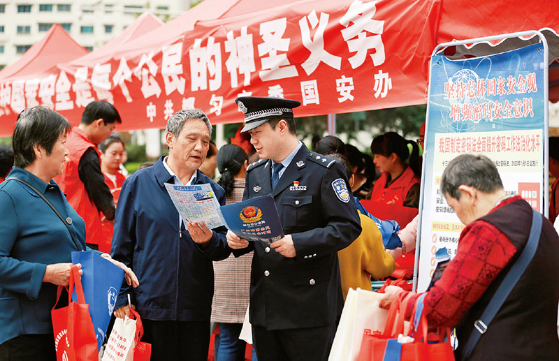 黨的十八大以來,在以習(xí)近平同志為核心的黨中央堅(jiān)強(qiáng)領(lǐng)導(dǎo)下,我國(guó)經(jīng)受住了來自政治、經(jīng)濟(jì)、意識(shí)形態(tài)、自然界等方面的風(fēng)險(xiǎn)挑戰(zhàn)考驗(yàn),國(guó)家安全得到全面加強(qiáng),為黨和國(guó)家興旺發(fā)達(dá)、長(zhǎng)治久安提供了有力保證。圖為2023年4月15日,在貴州省黔南布依族苗族自治州都勻市人民廣場(chǎng),民警向市民講解國(guó)家安全等法律法規(guī)知識(shí)。當(dāng)日是第八個(gè)全民國(guó)家安全教育日,各地開展形式多樣的國(guó)家安全教育主題活動(dòng),提高人們的國(guó)家安全意識(shí)。 新華社發(fā) 肖偉/攝