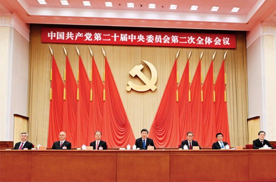 中國共產(chǎn)黨第二十屆中央委員會第二次全體會議,于2023年2月26日至28日在北京舉行。這是習近平、李強、趙樂際、王滬寧、蔡奇、丁薛祥、李希等在主席臺上。 新華社記者 謝環(huán)馳/攝