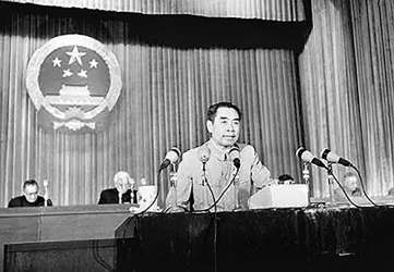 1954年9月,周恩來在一屆全國人大一次會議上作《政府工作報告》,明確提出要把我國建設成為具有強大的現(xiàn)代化的工業(yè)、農業(yè)、交通運輸業(yè)和現(xiàn)代化國防的社會主義國家。