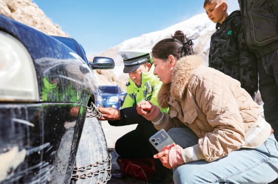 多年來,當學(xué)生寒暑假大規(guī)模返校和回家時,新疆葉城縣都會組織黨員干部帶隊,動員縣、鄉(xiāng)、村三級力量,用心用情守護上學(xué)路。圖為2024年2月22日,在前往西合休鄉(xiāng)中心小學(xué)翻越海拔4000多米的雪山途中,駕駛員和葉城縣公安局交通管理大隊工作人員一起為接送學(xué)生的車輛安裝防滑鏈。 新華社記者 胡虎虎/攝