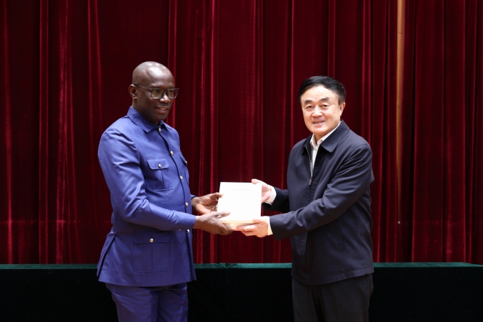 主旨演講后,曲青山院長向恩迪庫里約總書記贈送了由中共中央黨史和文獻研究院編輯翻譯出版的《習近平關(guān)于中國式現(xiàn)代化論述摘編》英文版和《中國共產(chǎn)黨簡史》法文版圖書。