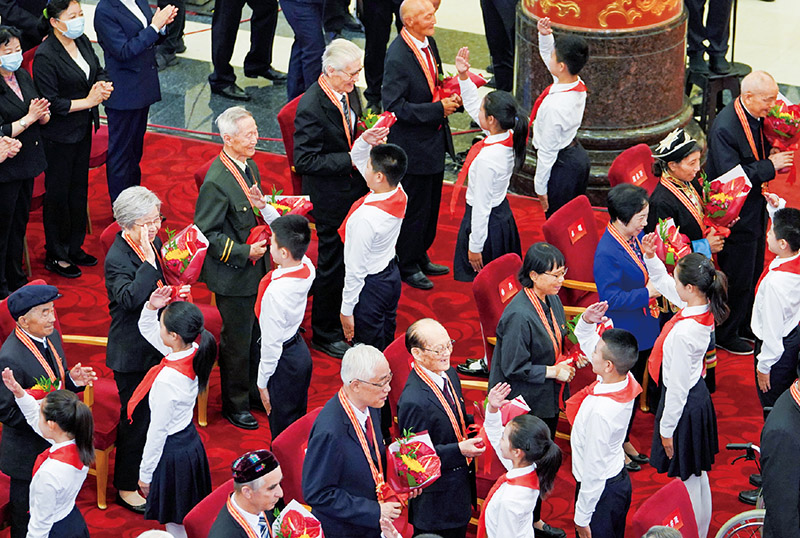2021年6月29日,慶祝中國共產(chǎn)黨成立100周年“七一勛章”頒授儀式在北京人民大會(huì)堂金色大廳隆重舉行。這是少先隊(duì)員向勛章獲得者獻(xiàn)花,敬禮致意。 新華社記者 高潔/攝