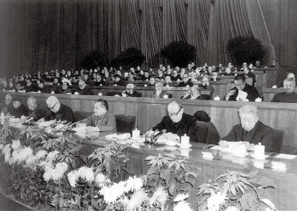 1982 年12 月11 日,全國政協(xié)五屆五次會議通過新修訂的政協(xié)章程。圖為鄧小平(前排右三)等在主席臺上