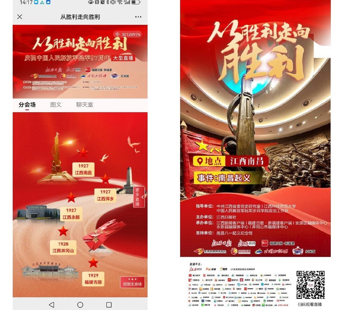 為貫徹2024年全國(guó)黨史和文獻(xiàn)部門宣教工作培訓(xùn)班精神,大力發(fā)揮新媒體和短視頻在黨史宣傳教育中的重要作用,創(chuàng)新思路、創(chuàng)新形式、創(chuàng)新內(nèi)容,全力做好新形勢(shì)下黨史宣教工作,推動(dòng)黨史學(xué)習(xí)教育常態(tài)化長(zhǎng)效化。8月1日,由江西省委黨史研究室領(lǐng)銜指導(dǎo)的“從勝利走向勝利——慶祝中國(guó)人民解放軍建軍97周年大型直播”在全網(wǎng)隆重推出。