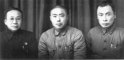 抗戰(zhàn)期間,張?jiān)埔荩ㄗ螅?、?xiàng)英(中)、陳毅(右)合影。 圖片來源:視覺中國(guó)