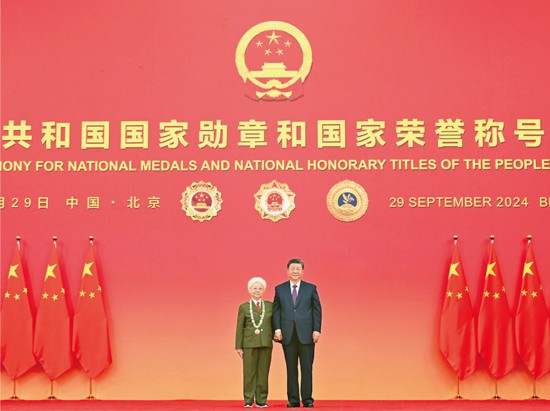 2024年9月29日,中華人民共和國國家勛章和國家榮譽(yù)稱號頒授儀式在北京人民大會堂金色大廳隆重舉行。中共中央總書記、國家主席、中央軍委主席習(xí)近平向“人民藝術(shù)家”國家榮譽(yù)稱號獲得者田華頒授獎(jiǎng)?wù)隆?新華社記者 謝環(huán)馳/攝