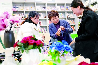 在重慶市北碚區(qū)水土街道萬(wàn)壽社區(qū)青年夜校,老師指導(dǎo)青年職工學(xué)習(xí)制作絲網(wǎng)花,幫助青年職工豐富文化生活。新華社發(fā)
