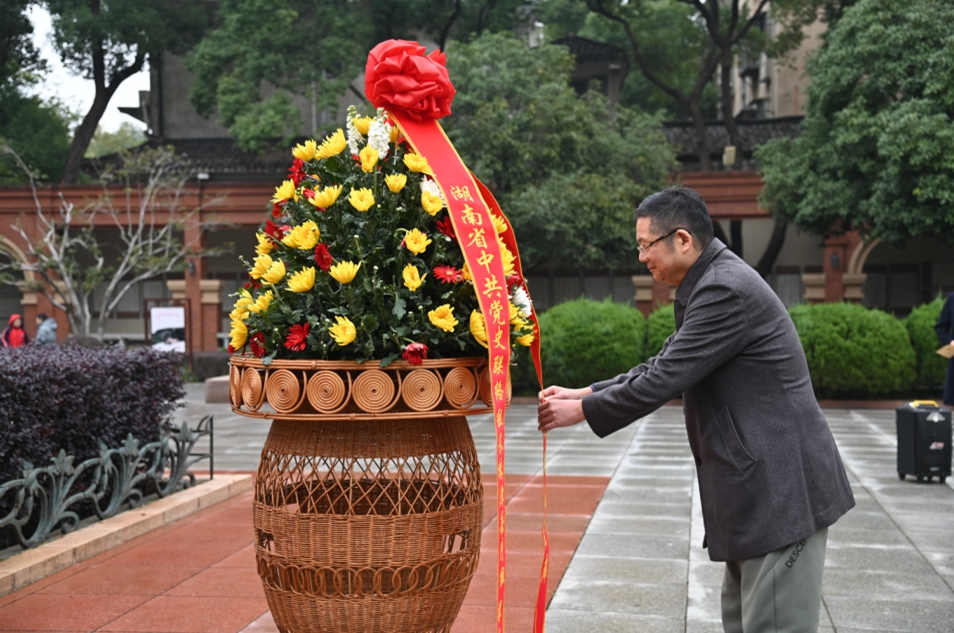 省黨史聯(lián)絡(luò)組長株潭岳片組組長、省委組織部原副部長蔡建和在中國共產(chǎn)黨長沙歷史館向毛澤東同志塑像敬獻(xiàn)花籃