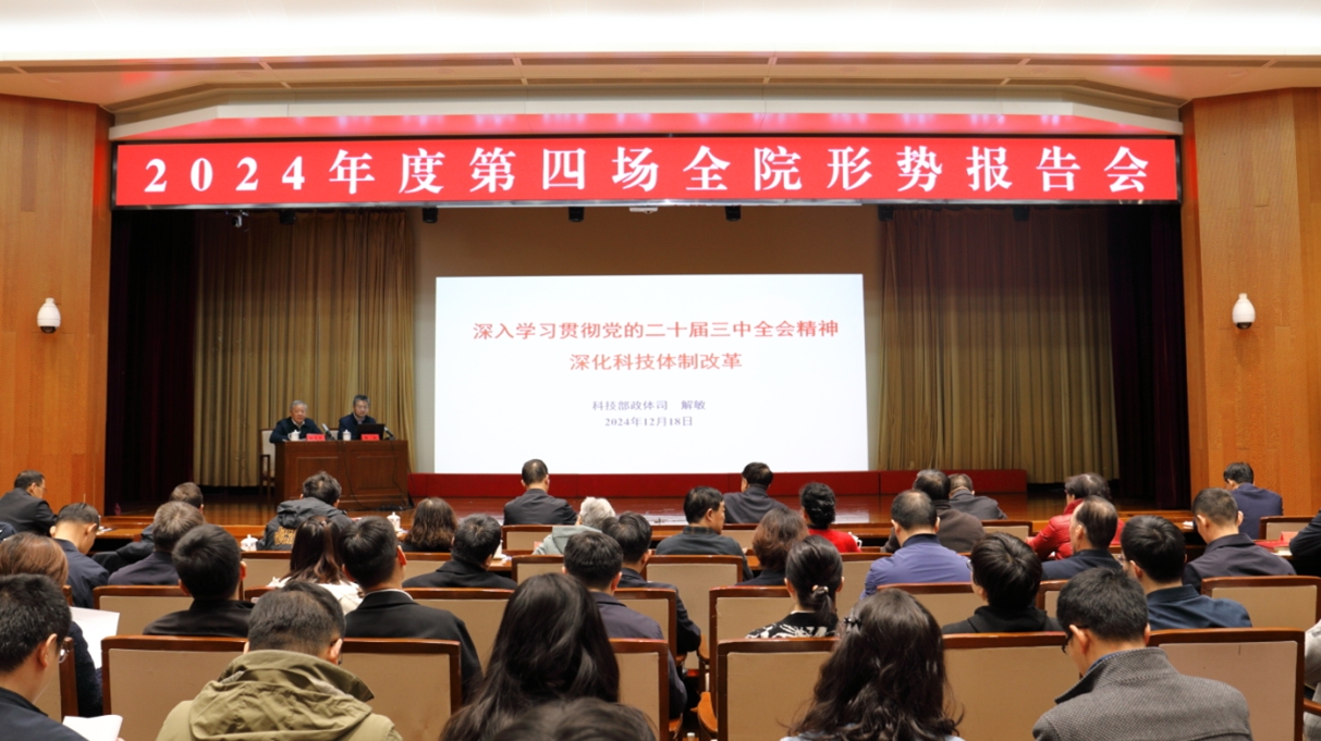 為進(jìn)一步深入學(xué)習(xí)貫徹黨的二十屆三中全會(huì)精神,12月18日,我院舉辦2024年度第四場(chǎng)形勢(shì)報(bào)告會(huì),邀請(qǐng)科技部政策法規(guī)與創(chuàng)新體系建設(shè)司司長(zhǎng)解敏作報(bào)告。報(bào)告會(huì)前,曲青山院長(zhǎng)會(huì)見了解敏同志。副院長(zhǎng)、機(jī)關(guān)黨委書記孫東升主持會(huì)議,院務(wù)會(huì)成員,中央紀(jì)委國家監(jiān)委駐中辦紀(jì)檢監(jiān)察組副組長(zhǎng)胡鍵等同志出席,全院在職黨員、干部,離退休干部黨委書記、副書記,離退休干部黨支部書記,共600人參加報(bào)告會(huì)。
