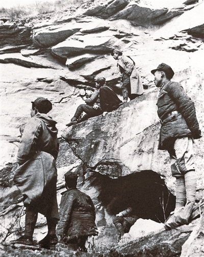 延安電影團(tuán)成員們在清涼山的巖石上拍攝素材。