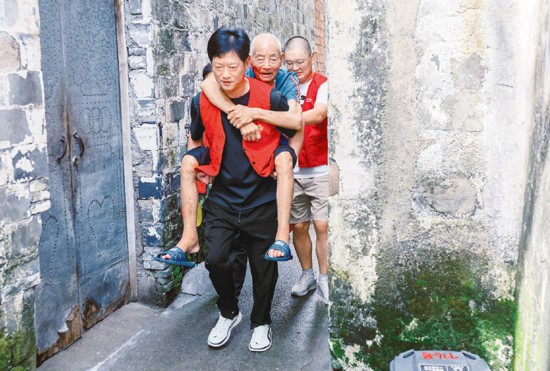 新時(shí)代以來(lái),廣大黨員干部注重走好新時(shí)代群眾路線,不斷把我們黨密切聯(lián)系群眾的優(yōu)良作風(fēng)發(fā)揚(yáng)光大。圖為2024年9月19日,臺(tái)風(fēng)“普拉?!北平覈?guó)華東沿海,浙江省諸暨市趙家鎮(zhèn)泉畈村村干部和黨員志愿者在臺(tái)風(fēng)來(lái)臨前轉(zhuǎn)移老舊房里的老人。 新華社記者 徐昱/攝