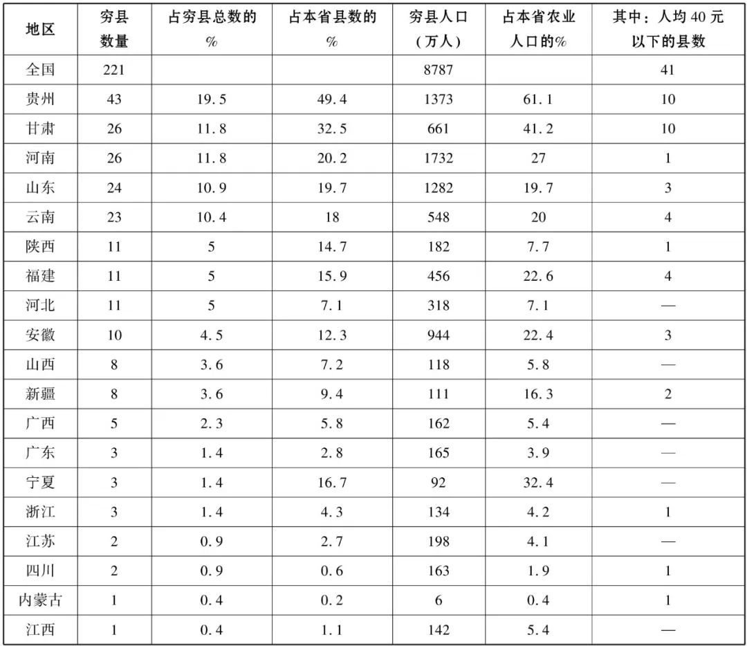 表1顯示,1977年至1979年各省、區(qū)連續(xù)三年人均分配收入50元以下窮縣數(shù)量,超過(guò)20個(gè)的有五個(gè)省,分別為貴州、甘肅、河南、山東和云南;10個(gè)及以上的有九個(gè)省,除上述五省外,還有陜西、福建、河北和安徽。九個(gè)省、市未出現(xiàn)在上表,因?yàn)椤氨本⑻旖?、上海、湖南、湖北、遼寧、吉林、黑龍江、青海9省、市,沒(méi)有人均分配收入連續(xù)3年都在50元以下的窮縣,其中北京、天津、上海、吉林4省、市在1977年至1979年3年中,沒(méi)有出現(xiàn)過(guò)人均分配收入50元以下的窮縣”。