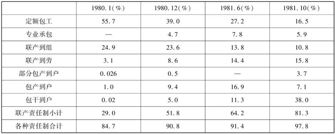 1982年10月27日至11月23日,全國(guó)農(nóng)村思想政治工作會(huì)議和全國(guó)農(nóng)業(yè)書(shū)記會(huì)議在京召開(kāi)。萬(wàn)里在講話中指出:“現(xiàn)在有些經(jīng)濟(jì)發(fā)達(dá)的地區(qū)也實(shí)行了‘統(tǒng)一經(jīng)營(yíng),包干分配’的責(zé)任制,應(yīng)該支持和幫助他們?!?1月11日,國(guó)務(wù)院領(lǐng)導(dǎo)與參加全國(guó)農(nóng)業(yè)書(shū)記會(huì)議的同志座談并講話,明確改變了經(jīng)濟(jì)發(fā)達(dá)的地區(qū)不適合包產(chǎn)到戶的觀點(diǎn)。他認(rèn)為過(guò)去把雙包責(zé)任制看成只是那些生產(chǎn)水平低下的貧困地區(qū)所適合的簡(jiǎn)單辦法,而經(jīng)過(guò)兩年實(shí)踐,這種責(zé)任制形式在深度和廣度上都大大前進(jìn)了,成為當(dāng)前農(nóng)村中的主要責(zé)任制形式。從目前聯(lián)產(chǎn)承包責(zé)任制的變動(dòng)趨勢(shì)看,在多種形式的生產(chǎn)責(zé)任制中,家庭聯(lián)產(chǎn)承包責(zé)任制越來(lái)越成為主要的形式,可能只有很少的地方不能實(shí)行這種責(zé)任制。他強(qiáng)調(diào)說(shuō),各地要有一點(diǎn)精神準(zhǔn)備,不要再堵它,不要再筑墻了。他進(jìn)一步以江蘇宜興縣包干到戶的材料說(shuō)明這一問(wèn)題:家庭(或小組)聯(lián)產(chǎn)承包責(zé)任制的推行,在很大程度上并不受生產(chǎn)力水平高低、多種經(jīng)營(yíng)內(nèi)容多少的限制,不同地區(qū)都可以采用,原則是一樣的,只不過(guò)具有不同的形式。宜興縣所在的蘇南是全國(guó)農(nóng)村集體經(jīng)濟(jì)最發(fā)達(dá)的地區(qū)之一,包干到戶既然在本地區(qū)是適宜的,其他地區(qū)也沒(méi)有任何理由再提出本地不適合包干到戶。經(jīng)過(guò)此次會(huì)議,中央推行家庭聯(lián)產(chǎn)承包制的態(tài)度已十分明確。同一天,《中國(guó)農(nóng)民報(bào)》對(duì)宜興經(jīng)驗(yàn)做了報(bào)道。截至報(bào)道時(shí)間,“全縣實(shí)行包干分配的生產(chǎn)隊(duì)已達(dá)77%以上”。五屆全國(guó)人大五次會(huì)議的政府工作報(bào)告再次強(qiáng)調(diào),大包干既適用于貧困邊遠(yuǎn)地區(qū),也適用于經(jīng)濟(jì)水平較高的富裕地區(qū),“對(duì)群眾樂(lè)意推行的家庭聯(lián)產(chǎn)承包責(zé)任制或其他形式,一律不能去堵”。根據(jù)農(nóng)牧漁業(yè)部公社局1982年11月25日的統(tǒng)計(jì),一些省市雙包到戶的比例還不足50%,部分還不足10%(見(jiàn)表3),說(shuō)明這一決定有著很明確的針對(duì)性。