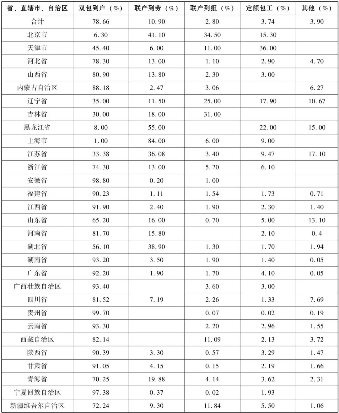 雙包到戶占比在90%以上的有11個(gè)省份,和1981年10月統(tǒng)計(jì)的雙包到戶超過(guò)50%的省份相比,多了湖南、陜西,少了內(nèi)蒙古、河南;介于80%—90%的省份為內(nèi)蒙古、西藏和山西、河南、四川;介于70%—80%的省份為新疆、河北、浙江和青海;介于60%—70%的省份為山東;介于50%—60%的省份為湖北;50%以下的為北京、上海、天津和黑龍江、吉林、遼寧、江蘇,其中北京、上海和黑龍江的雙包到戶比例低于10%。雙包到戶占比低于50%的省份均包含農(nóng)村經(jīng)濟(jì)發(fā)達(dá)地區(qū)和適于機(jī)械化地區(qū)。這兩類地區(qū)在1982年底至1983年春向雙包到戶轉(zhuǎn)變。1983年1月10日,鐵瑛在《中國(guó)農(nóng)民報(bào)》發(fā)文,以經(jīng)濟(jì)較發(fā)達(dá)的嘉興地區(qū)的調(diào)查材料,說(shuō)明家庭式的聯(lián)產(chǎn)承包責(zé)任制“同樣適用于經(jīng)濟(jì)比較發(fā)達(dá)的地區(qū)”。1982年12月24日,黑龍江省委第一書(shū)記楊易辰在地市縣委書(shū)記會(huì)議上的講話中提出:“無(wú)論哪種聯(lián)產(chǎn)承包責(zé)任制形式,只要群眾愿意實(shí)行,都要有領(lǐng)導(dǎo)地實(shí)行?!边@次會(huì)議后,黑龍江省家庭聯(lián)產(chǎn)承包責(zé)任制得到迅速發(fā)展,據(jù)1983年春節(jié)(2月13日)前統(tǒng)計(jì),全省落實(shí)各種聯(lián)產(chǎn)承包責(zé)任制的生產(chǎn)隊(duì)已占總數(shù)的95%以上,其中“包干到戶占百分之七十三,專業(yè)承包、包干分配占百分之七,農(nóng)機(jī)隊(duì)(組)承包和機(jī)、勞分包占百分之五,聯(lián)產(chǎn)到勞(組)占百分之十”。