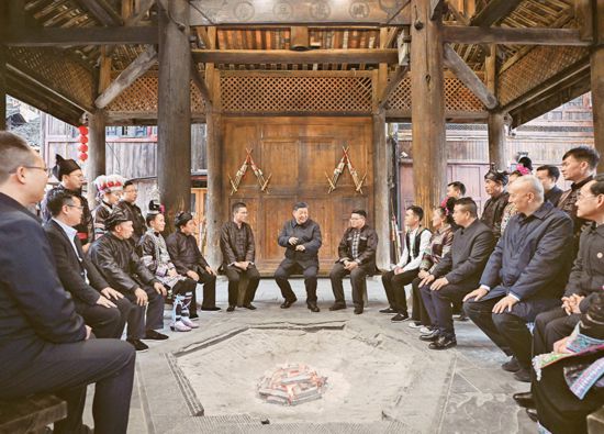 2025年3月17日至18日,中共中央總書(shū)記、國(guó)家主席、中央軍委主席習(xí)近平在貴州考察。這是17日下午,習(xí)近平在黔東南州黎平縣肇興侗寨考察時(shí),在信團(tuán)鼓樓同村干部和村民代表圍坐在火塘邊,共話鄉(xiāng)村全面振興。 新華社記者 謝環(huán)馳/攝