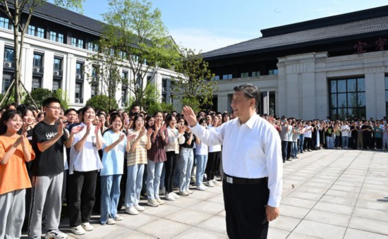 2022年4月25日上午,中共中央總書記、國家主席、中央軍委主席習近平來到中國人民大學考察調研。這是習近平向師生們揮手致意。新華社記者 謝環(huán)馳 攝