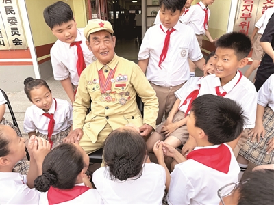 7月8日,吉林延吉,抗戰(zhàn)老兵在為青少年講述紅色故事,讓英雄精神在孩子們心中生根發(fā)芽。 圖片來源:視覺中國
